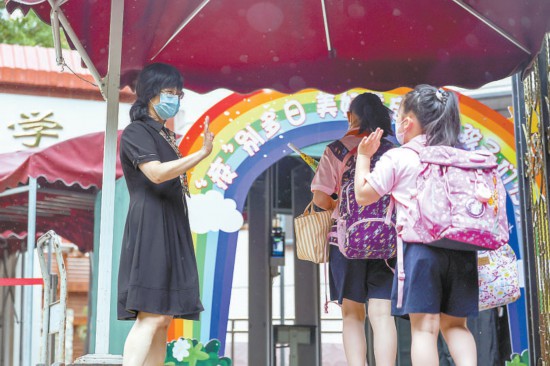 昨天早晨,豐臺區(qū)芳古園小學(xué),因疫情闊別校園多日的小學(xué)生返校復(fù)課,老師在校門口歡迎孩子們歸來。本報記者 鄧偉攝
