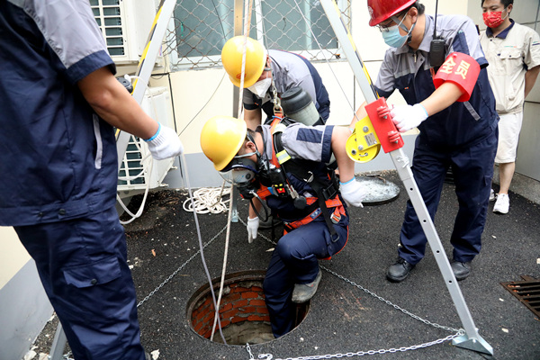 此次演練分為前期準(zhǔn)備、有限空間規(guī)范作業(yè)及作業(yè)人員遇險科學(xué)施救流程演示三個部分。首先,參演人員依次展示了作業(yè)審批、安全交底、工具檢查、現(xiàn)場安全檢查、封閉作業(yè)區(qū)域并設(shè)置警示標(biāo)志等作業(yè)前期準(zhǔn)備工作。隨后,對有限空間出入口的有毒有害氣體、氧氣濃度進行檢測并進行自然通風(fēng)或使用機械設(shè)備進行強制通風(fēng),待監(jiān)測評估符合作業(yè)要求后,架設(shè)救援用三腳架,參演人員穿戴好有限空間作業(yè)器具并經(jīng)檢查合格后,在持續(xù)通風(fēng)并有人員進行安全監(jiān)護的條件下,下井作業(yè)。最后,為避免因有限空間作業(yè)發(fā)生事故后盲目施救而產(chǎn)生連鎖事故,由救援人員展示如何正確穿戴呼吸器等救援防護用品并確保自身安全的前提下下井救援,利用三腳架等設(shè)備將受困人員安全救出并脫離危險場所的同時呼叫救援,進行心肺復(fù)蘇等規(guī)范施救流程。