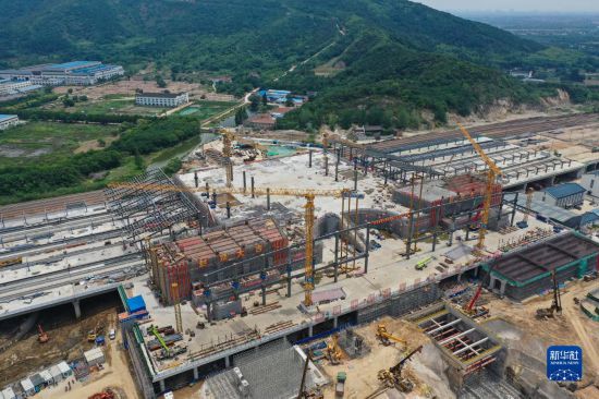 6月26日拍攝的南沿江鐵路江陰站站房主體結(jié)構(gòu)封頂施工現(xiàn)場(無人機(jī)照片)。