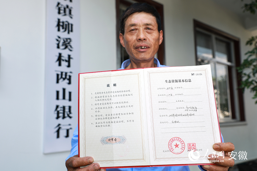 村民許雪峰展示《生態(tài)資源受益權證》。人民網 張俊攝