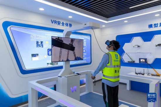 工作人員在雄安新區(qū)一智慧工地展示廳進(jìn)行工地VR安全體驗(yàn)(2022年4月13日攝)。新華社發(fā)(高盟 攝)