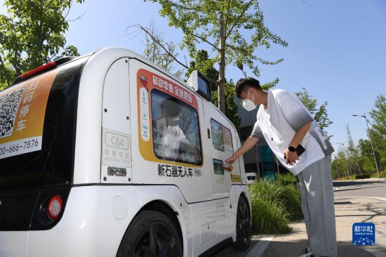 在雄安市民服務(wù)中心,市民在智能無人售賣車購(gòu)買飲料(2022年5月27日攝)。新華社記者 朱旭東 攝