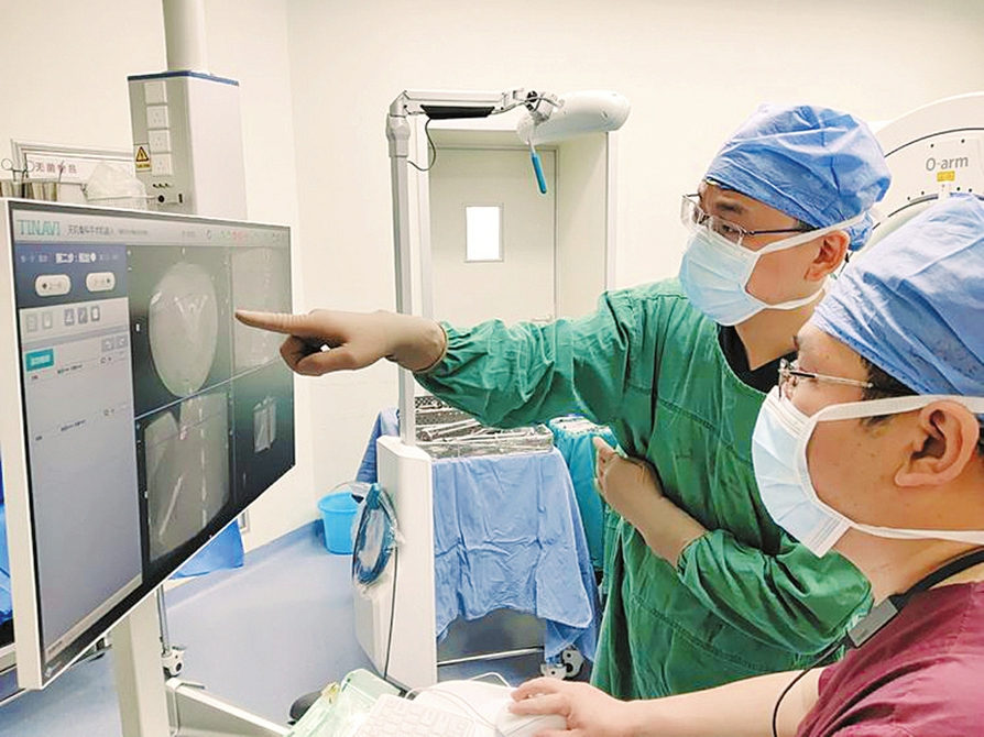 近日,山西醫(yī)科大學(xué)第二醫(yī)院趙斌教授、趙軼波副主任醫(yī)師團(tuán)隊(duì)完成省內(nèi)首例脊柱機(jī)器人導(dǎo)航可視化置釘手術(shù),耗時(shí)2小時(shí),出血量?jī)H50毫升,患者術(shù)后恢復(fù)良好,第3天可下床活動(dòng)。手術(shù)在機(jī)器人的輔助下,精準(zhǔn)有效置入椎弓根螺釘,縮短了手術(shù)時(shí)間,有效控制術(shù)中出血,顯著減少了放射線對(duì)醫(yī)生和患者的輻射,極大提高了手術(shù)效率和安全性。(周慧芳 高志國(guó)圖/文)