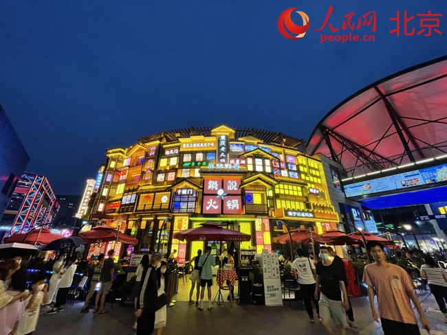 雖是工作日傍晚,剛過6點,華熙LIVE·五棵松的街區(qū)上人已熙熙攘攘,要想嘗嘗網(wǎng)紅餐廳,已經(jīng)需要拿號等位了。順著香味一路走,一家裝潢極具重慶吊腳樓特色的火鍋店十分引人注目,成了夜景打卡地,飄香的麻辣味也勾起了不少食客的“饞蟲”。