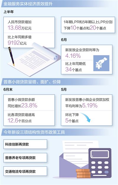 數(shù)據(jù)顯示,上半年,我國社會融資規(guī)模增量為21萬億元,同比多增3.2萬億元,人民幣貸款增加13.68萬億元,比上年同期多增9192億元。與此同時,央行持續(xù)釋放貸款市場報價利率(LPR)改革潛力,1年期LPR和5年期以上LPR分別下降10個基點和20個基點,6月份新發(fā)放企業(yè)貸款利率為4.16%,比上年同期低34個基點,企業(yè)綜合融資成本穩(wěn)中有降,金融服務實體經濟的質量和效率明顯提升。
