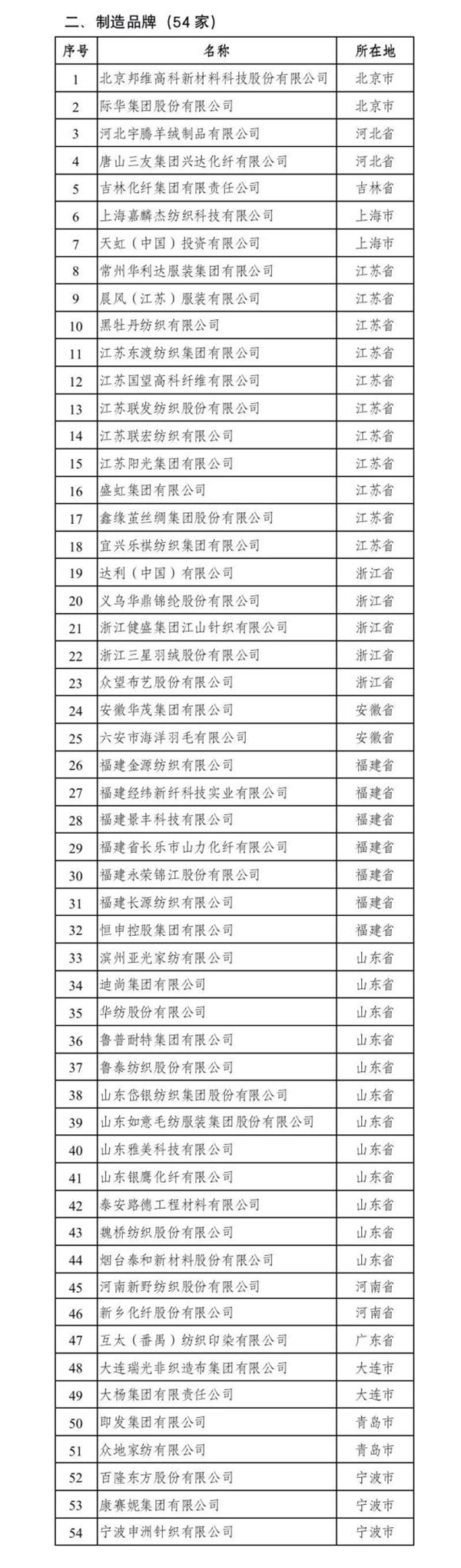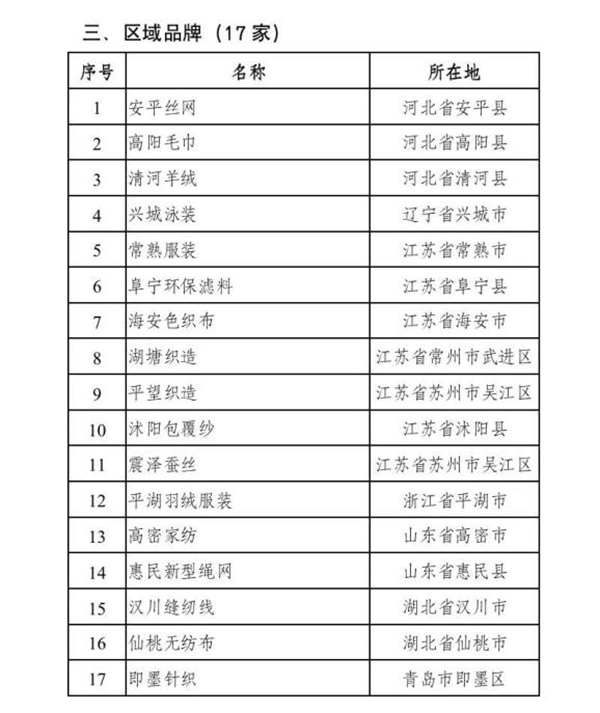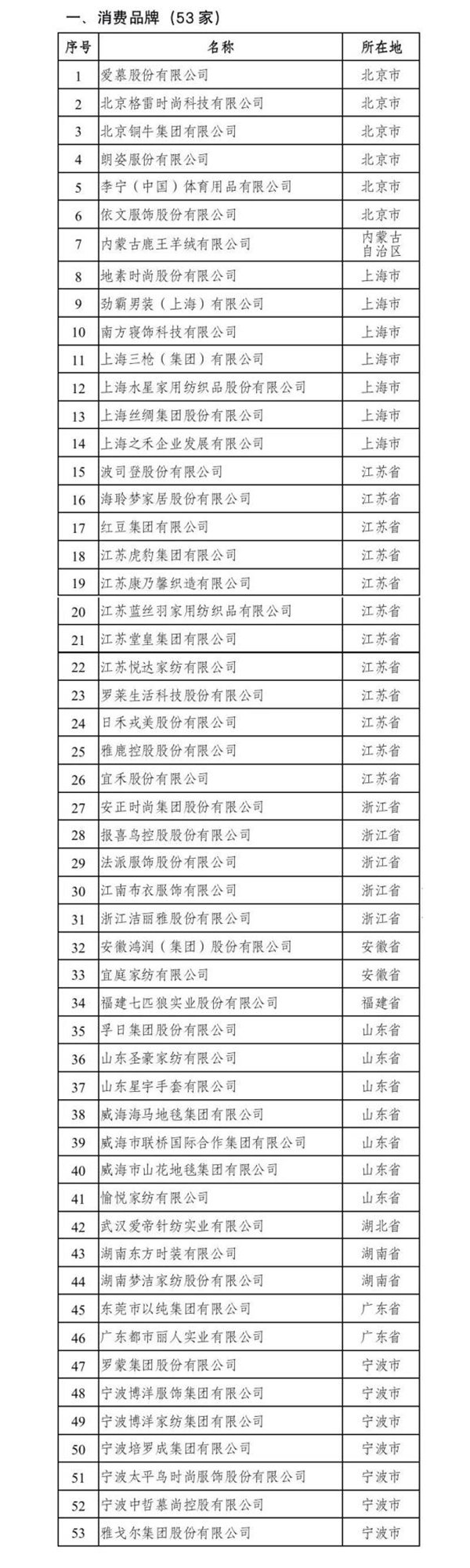 此次入選的江蘇消費(fèi)品牌包括波司登、海聆夢(mèng)家居、紅豆、虎豹、康乃馨、藍(lán)絲羽、堂皇、悅達(dá)家紡、羅萊、日禾戎美、雅鹿、宜禾等。制造品牌包括常州華利達(dá)、晨風(fēng)、黑牡丹紡織、東渡紡織、國(guó)望高科纖維、聯(lián)發(fā)紡織、聯(lián)宏紡織、陽(yáng)光、盛虹、鑫緣、宜興樂祺等。區(qū)域品牌包括常熟服裝、阜寧環(huán)保濾料、海安色織布、湖塘織造、平望織造、沭陽(yáng)包覆紗、震澤蠶絲等。