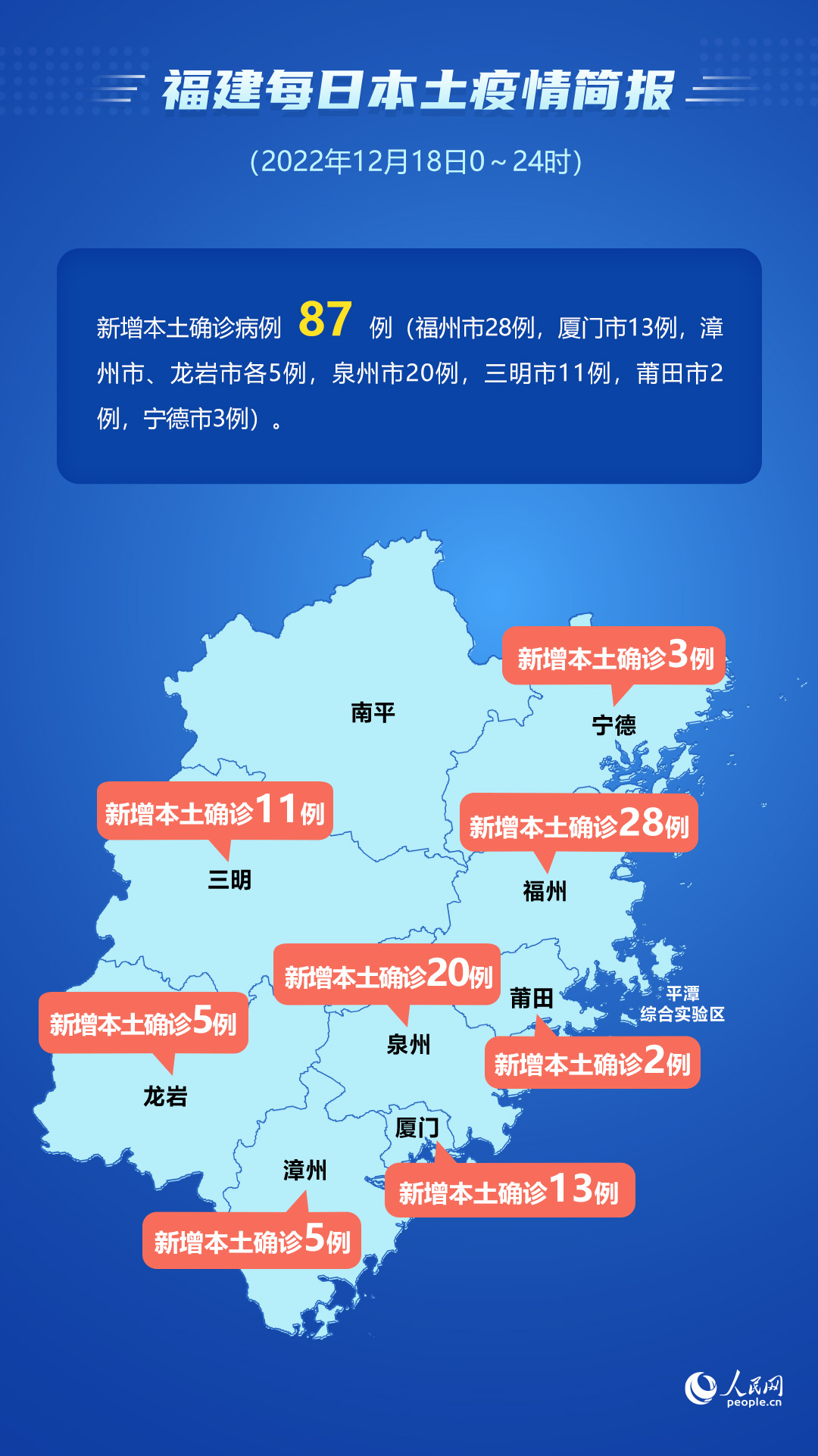 人民網福州12月19日電 (江葦杭、陳永整)據福建省衛(wèi)健委網站消息,12月18日0-24時,福建省報告新增本土確診病例87例(福州市28例,廈門市13例,漳州市、龍巖市各5例,泉州市20例,三明市11例,莆田市2例,寧德市3例)。目前,全省本土確診病例住院563例,無死亡病例。