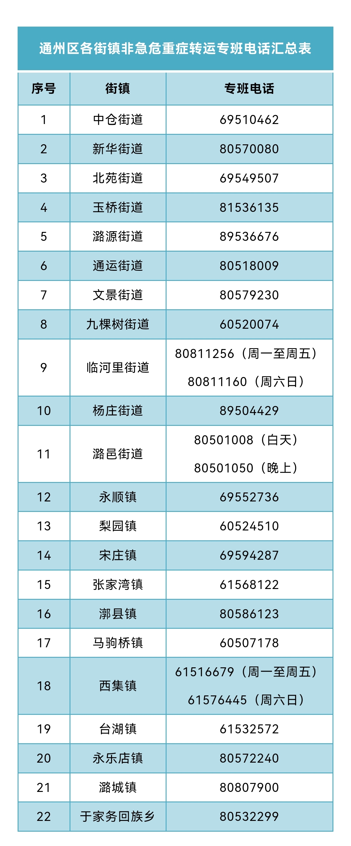 人民網(wǎng)北京12月21日電 為進(jìn)一步保障非急危重癥群眾就醫(yī)需求,不擠占120醫(yī)療急救資源,暢通就醫(yī)出行通道,將120救護(hù)車(chē)留給急危重癥患者,北京市通州區(qū)向社會(huì)公布各街道鄉(xiāng)鎮(zhèn)非急危重癥轉(zhuǎn)運(yùn)專班熱線電話(具體熱線電話見(jiàn)下表)。