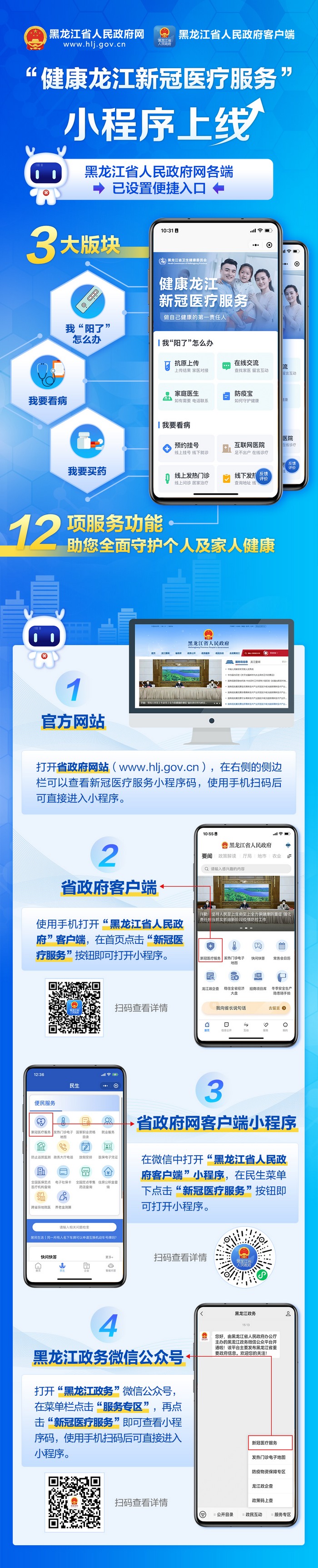 “健康龍江新冠醫(yī)療服務”小程序已經(jīng)正式上線,為了讓全省人民更加便捷地找到小程序,及時獲取服務,黑龍江省人民政府網(wǎng)站、官方客戶端、小程序、官方微信公眾號等平臺已全面開通“健康龍江新冠醫(yī)療服務”便捷入口。3大板塊12項服務功能助您全面守護個人及家人健康。