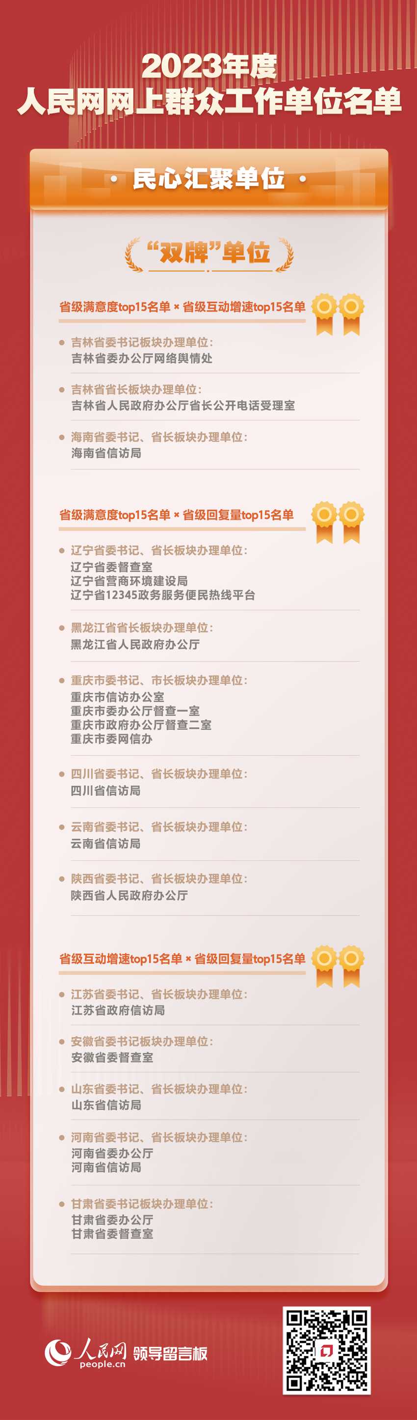 此次公布的名單綜合全國各地區(qū)各部門各單位近一年來的滿意度、互動增速、回復(fù)量等指數(shù),著重突出各地區(qū)各部門各單位依托人民網(wǎng)“領(lǐng)導(dǎo)留言板”開展網(wǎng)上群眾工作情況,選出2023年度人民網(wǎng)網(wǎng)上群眾工作“民心匯聚單位”“實干擔當單位”“匯智為民單位”和“活力奮進單位”。