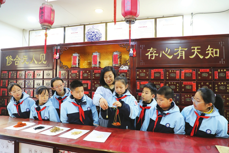 12月7日,陽(yáng)泉市城區(qū)小陽(yáng)泉北社區(qū)黨委聯(lián)合陽(yáng)泉市實(shí)驗(yàn)小學(xué),開展了“學(xué)習(xí)草藥知識(shí)、感受中醫(yī)魅力”課外實(shí)踐活動(dòng)。孩子們來(lái)到藥店,通過(guò)識(shí)別中草藥、稱量、加工中草藥材等具體活動(dòng),近距離體驗(yàn)中醫(yī)藥傳統(tǒng)文化特色,感受中醫(yī)藥魅力。圖為孩子們?cè)谒巹煹闹笇?dǎo)下稱量中草藥。(張春林?jǐn)z)
