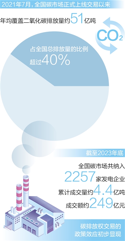2021年7月全國碳市場正式上線交易以來,運行整體平穩(wěn),年均覆蓋二氧化碳排放量約51億噸,占全國總排放量的比例超過40%。截至2023年底,全國碳市場共納入2257家發(fā)電企業(yè),累計成交量約4.4億噸,成交額約249億元,碳排放權(quán)交易的政策效應(yīng)初步顯現(xiàn)。