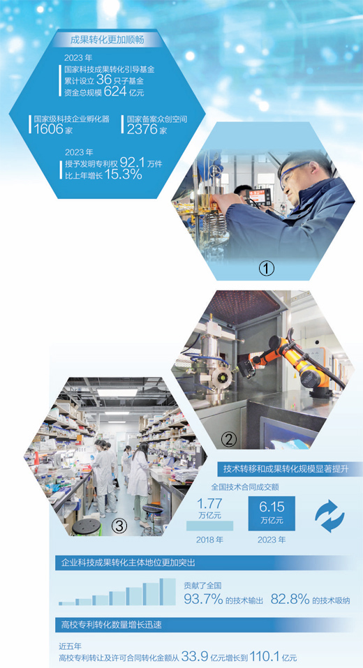 印發(fā)《“十四五”技術(shù)要素市場(chǎng)專(zhuān)項(xiàng)規(guī)劃》,從健全科技成果產(chǎn)權(quán)制度、強(qiáng)化高質(zhì)量科技成果供給等方面推動(dòng)成果轉(zhuǎn)化;印發(fā)《專(zhuān)利轉(zhuǎn)化運(yùn)用專(zhuān)項(xiàng)行動(dòng)方案(2023—2025年)》,對(duì)專(zhuān)利轉(zhuǎn)化運(yùn)用進(jìn)行專(zhuān)門(mén)部署;制定《高校和科研機(jī)構(gòu)存量專(zhuān)利盤(pán)活工作方案》,發(fā)揮市場(chǎng)和政府的協(xié)同作用,共同推動(dòng)專(zhuān)利成果更好更快地轉(zhuǎn)化為現(xiàn)實(shí)生產(chǎn)力……近年來(lái),一系列部署,一項(xiàng)項(xiàng)探索,讓創(chuàng)新鏈的好技術(shù)變成產(chǎn)業(yè)鏈的新應(yīng)用,科技創(chuàng)新正在成為培育發(fā)展新質(zhì)生產(chǎn)力的新動(dòng)能。