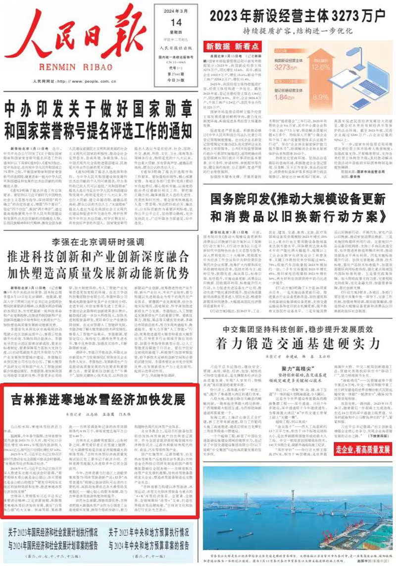 人民日報頭版聚焦吉林:寒地冰雪經濟加快發(fā)展