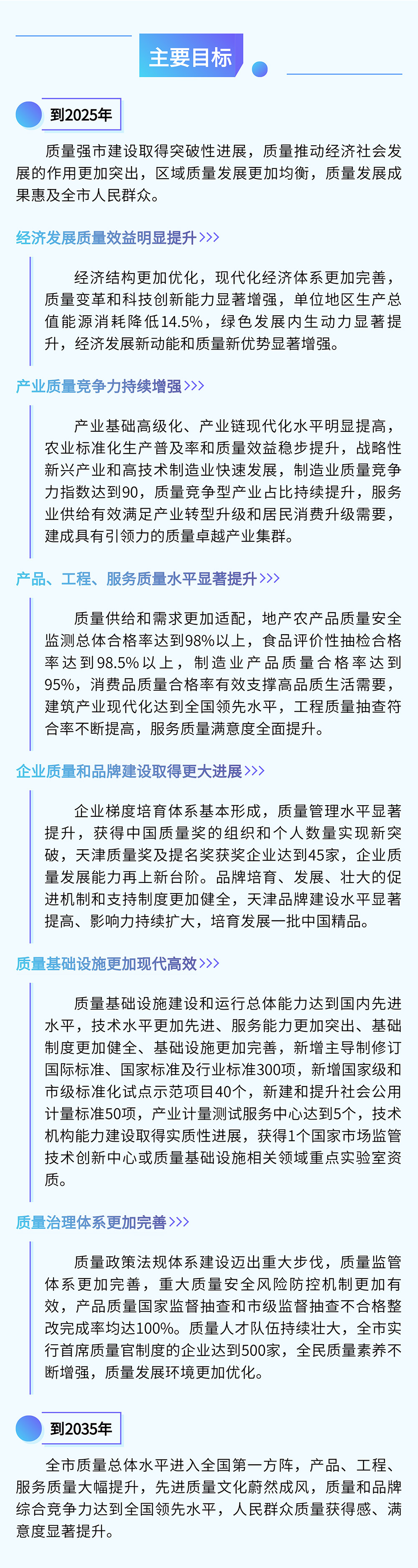 同時(shí),《綱要》聚焦高質(zhì)量發(fā)展,落實(shí)質(zhì)量強(qiáng)國(guó)部署要求?!顿|(zhì)量強(qiáng)國(guó)建設(shè)綱要》首次將質(zhì)量工作范疇從產(chǎn)品、工程、服務(wù)等微觀質(zhì)量領(lǐng)域,拓展到經(jīng)濟(jì)、產(chǎn)業(yè)、區(qū)域等宏觀質(zhì)量領(lǐng)域。按照貫徹《質(zhì)量強(qiáng)國(guó)建設(shè)綱要》精神不走樣、落實(shí)重大部署不漏項(xiàng)的原則,《綱要》結(jié)合全市發(fā)展現(xiàn)狀和客觀需求,相應(yīng)部署了推動(dòng)經(jīng)濟(jì)質(zhì)量效益型發(fā)展、增強(qiáng)產(chǎn)業(yè)和區(qū)域質(zhì)量競(jìng)爭(zhēng)力、加快產(chǎn)品質(zhì)量創(chuàng)新升級(jí)、推動(dòng)建設(shè)工程品質(zhì)化升級(jí)、促進(jìn)服務(wù)供給擴(kuò)容提質(zhì)、增強(qiáng)企業(yè)質(zhì)量和品牌發(fā)展能力、建設(shè)高水平質(zhì)量基礎(chǔ)設(shè)施、構(gòu)建現(xiàn)代高效質(zhì)量治理體系等8項(xiàng)具體任務(wù)。同時(shí),為確保各項(xiàng)重點(diǎn)任務(wù)落地落實(shí),同步設(shè)置了7個(gè)專欄,明確實(shí)施產(chǎn)業(yè)質(zhì)量競(jìng)爭(zhēng)力提升、重點(diǎn)產(chǎn)品質(zhì)量階梯攀登、建設(shè)工程質(zhì)量管理升級(jí)、服務(wù)品質(zhì)提升、天津品牌建設(shè)、質(zhì)量基礎(chǔ)設(shè)施能力提升、質(zhì)量安全監(jiān)管現(xiàn)代化等7項(xiàng)工程。