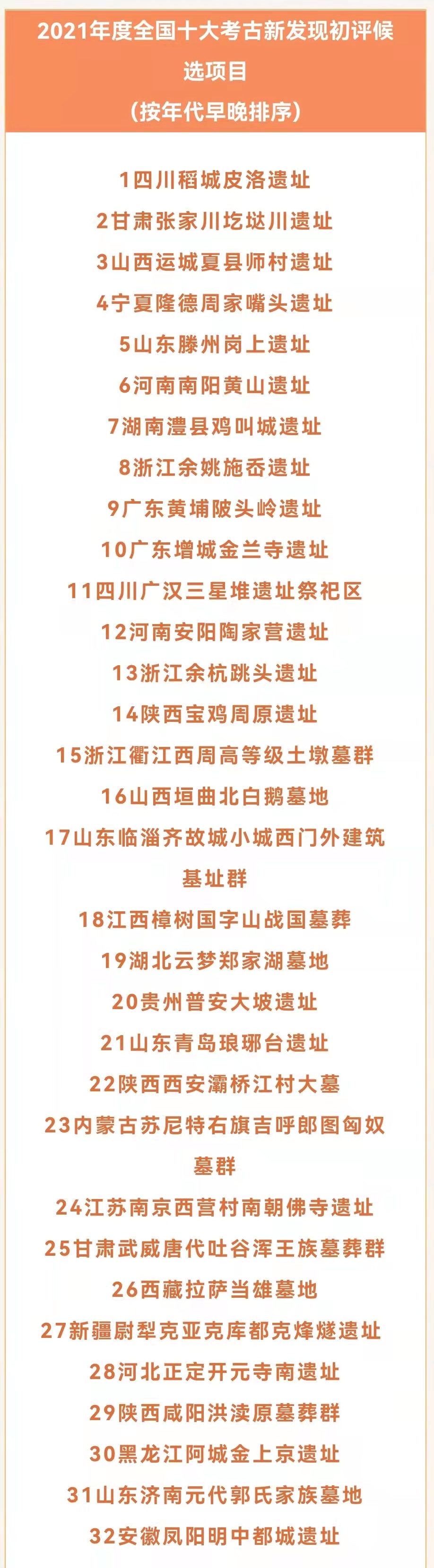 2021年,全國(guó)經(jīng)過審批的考古發(fā)掘1700余項(xiàng)。候選項(xiàng)目均為各發(fā)掘資質(zhì)單位主動(dòng)申報(bào),經(jīng)國(guó)家文物局審核,最終確定32項(xiàng)參評(píng)(名單如下)。評(píng)選活動(dòng)辦公室將組織投票推薦產(chǎn)生20項(xiàng)進(jìn)入終評(píng)。