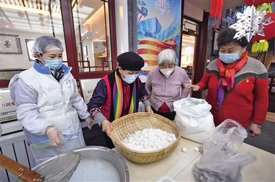 昨日,什剎海街道,居民在桂香村師傅的指導(dǎo)下學(xué)習(xí)手工搖元宵。新京報(bào)記者 王貴彬 攝