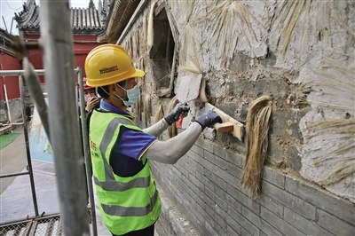 2021年9月16日,萬壽寺二期修繕工地,工人正在對墻體進行修繕。新京報記者 鄭新洽 攝