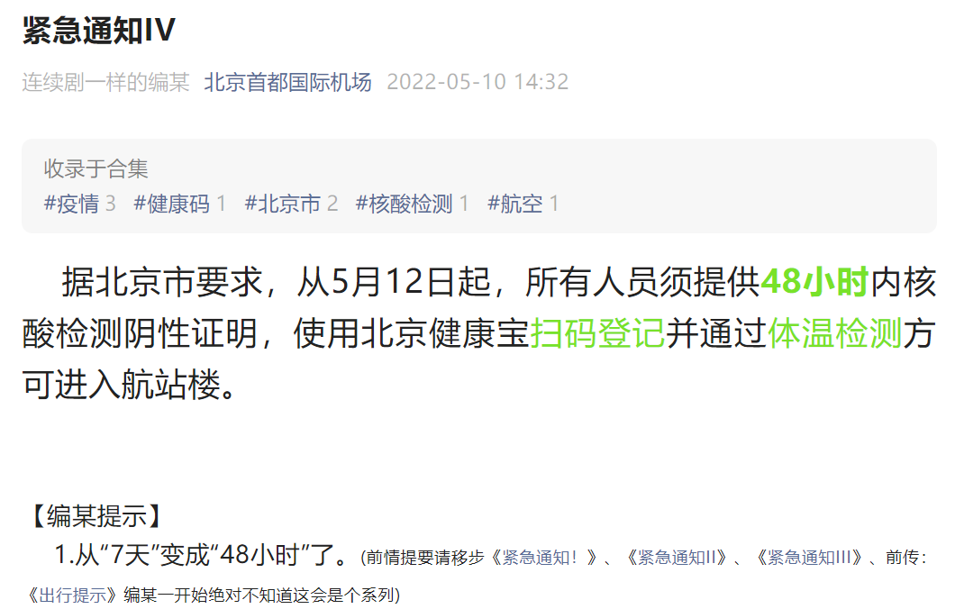 首都機(jī)場(chǎng):5月12日起,進(jìn)入航站樓須持48小時(shí)內(nèi)核酸檢測(cè)陰性證明