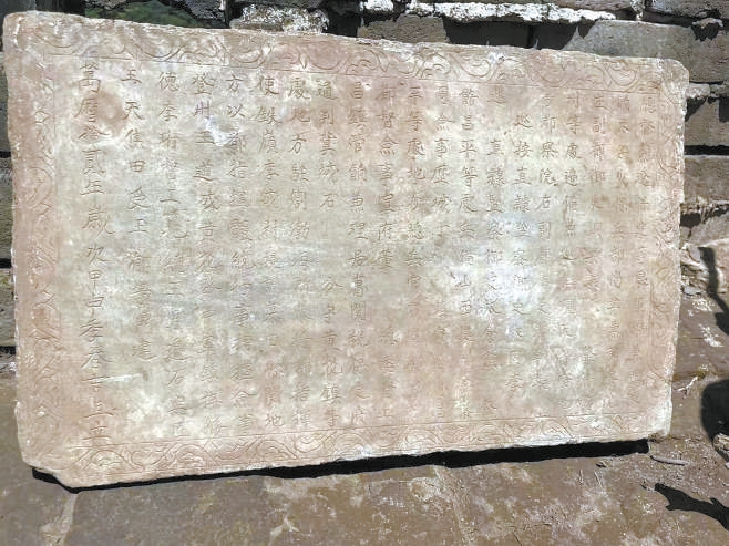 “發(fā)現(xiàn)一塊石碑,出土?xí)r碑文一面向下,推測這塊石碑原來鑲嵌在北側(cè)垛口墻內(nèi)側(cè),墻體傾斜倒塌后,石碑脫落?!表?xiàng)目考古負(fù)責(zé)人、北京考古研究院副研究員尚珩介紹。石碑為青石材質(zhì),保存完整,邊框刻著纏枝卷草紋。因?yàn)槊撀鋾r碑文面朝下,因此碑文保存完好,字體為繁體字,字跡娟秀,清晰可辨。