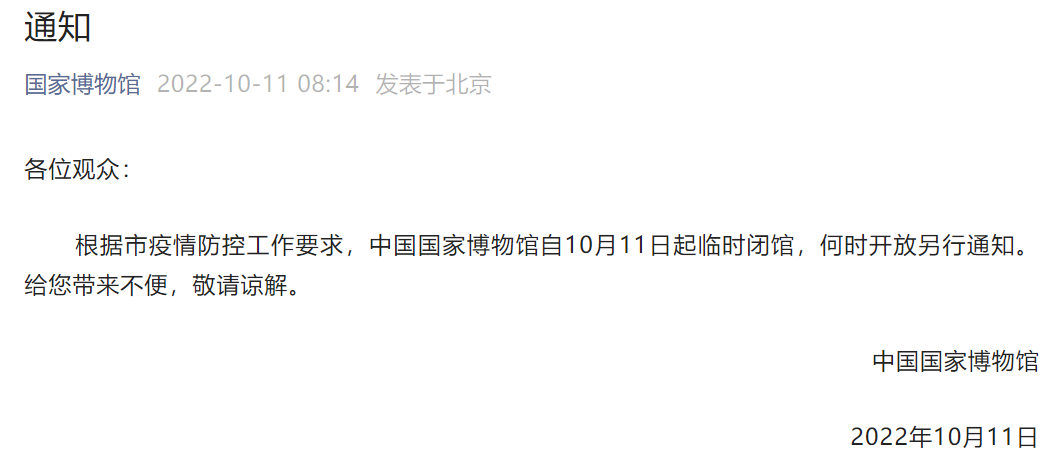 央廣網(wǎng)北京10月11日消息 據(jù)國家博物館官方微信公眾號(hào)消息,根據(jù)北京市疫情防控工作要求,中國國家博物館自10月11日起臨時(shí)閉館,何時(shí)開放另行通知。