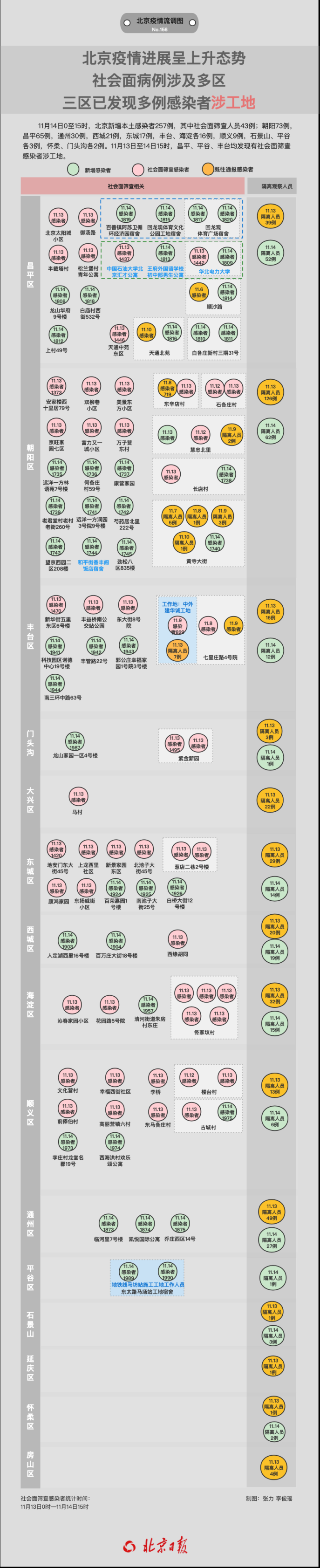 值得注意的是,11月13日至14日15時,已有豐臺、昌平、平谷三區(qū)報告感染者涉工地。其中