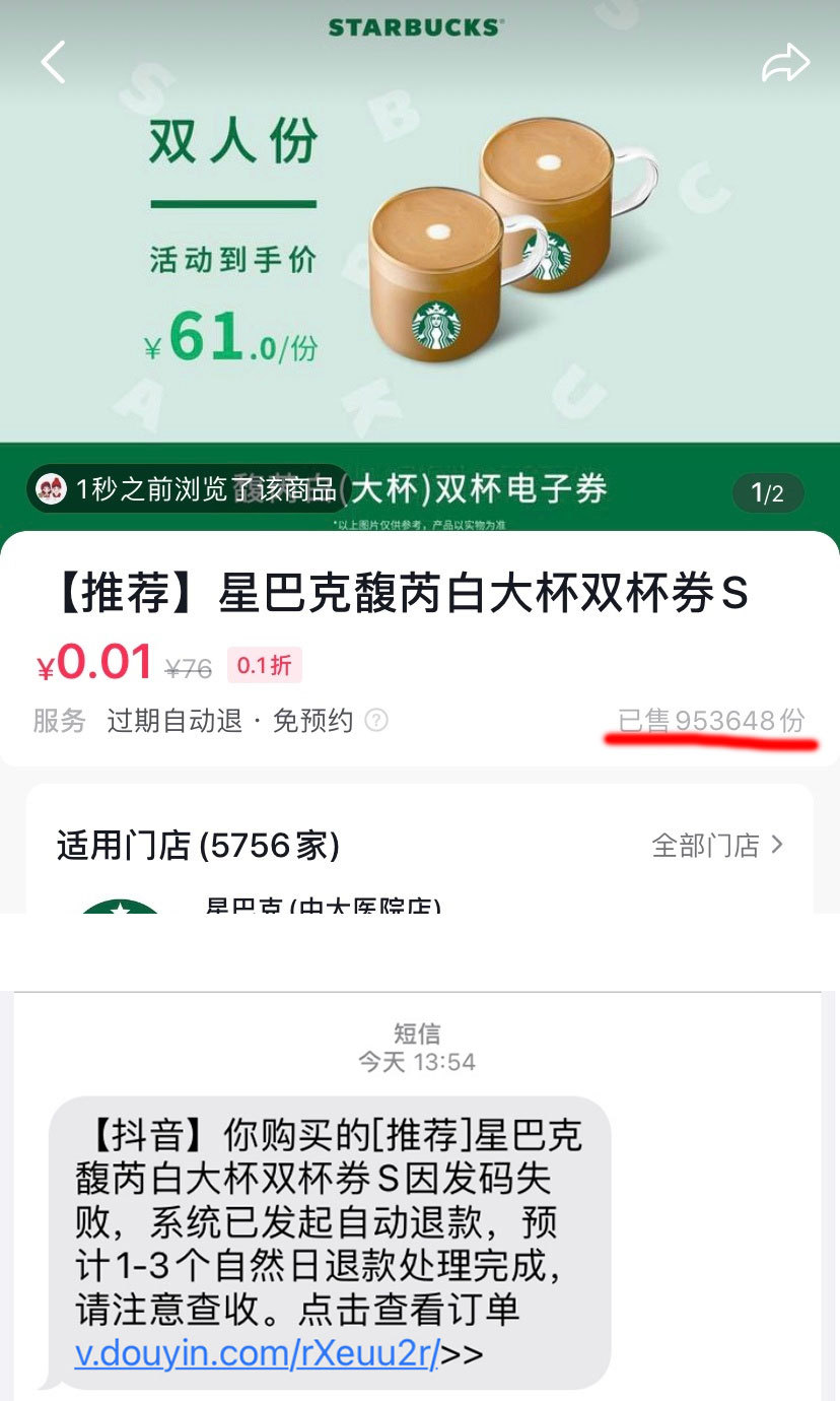央廣網(wǎng)記者注意到,23日有多名網(wǎng)友在社交平臺微博反饋,星巴克近日在某平臺推出0.01元購2杯馥芮白咖啡券團(tuán)購活動,賣出95萬多單。但是不少消費(fèi)者表示搶券后,發(fā)現(xiàn)無法兌換,被星巴克自動退款了。