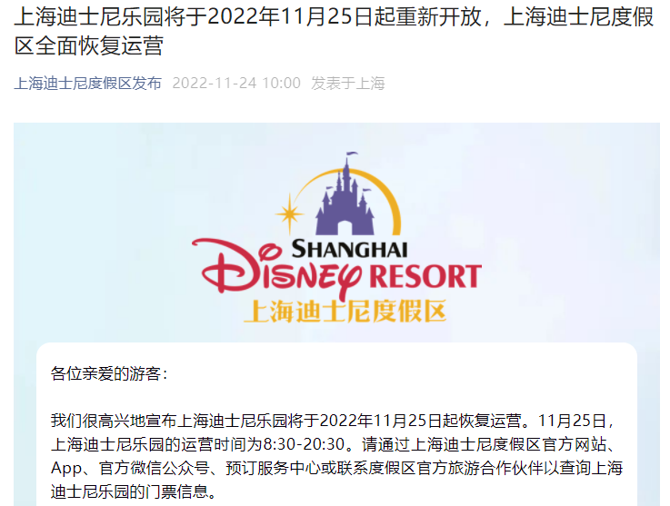11月25日起,上海迪士尼樂園恢復(fù)運(yùn)營
