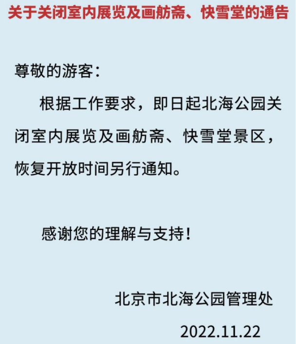 北京市北海公園管理處發(fā)布公告稱,根據(jù)工作要求,自11月22日起,北海公園關(guān)閉室內(nèi)展覽及畫舫齋、快雪堂景區(qū),恢復開放時間另行通知。