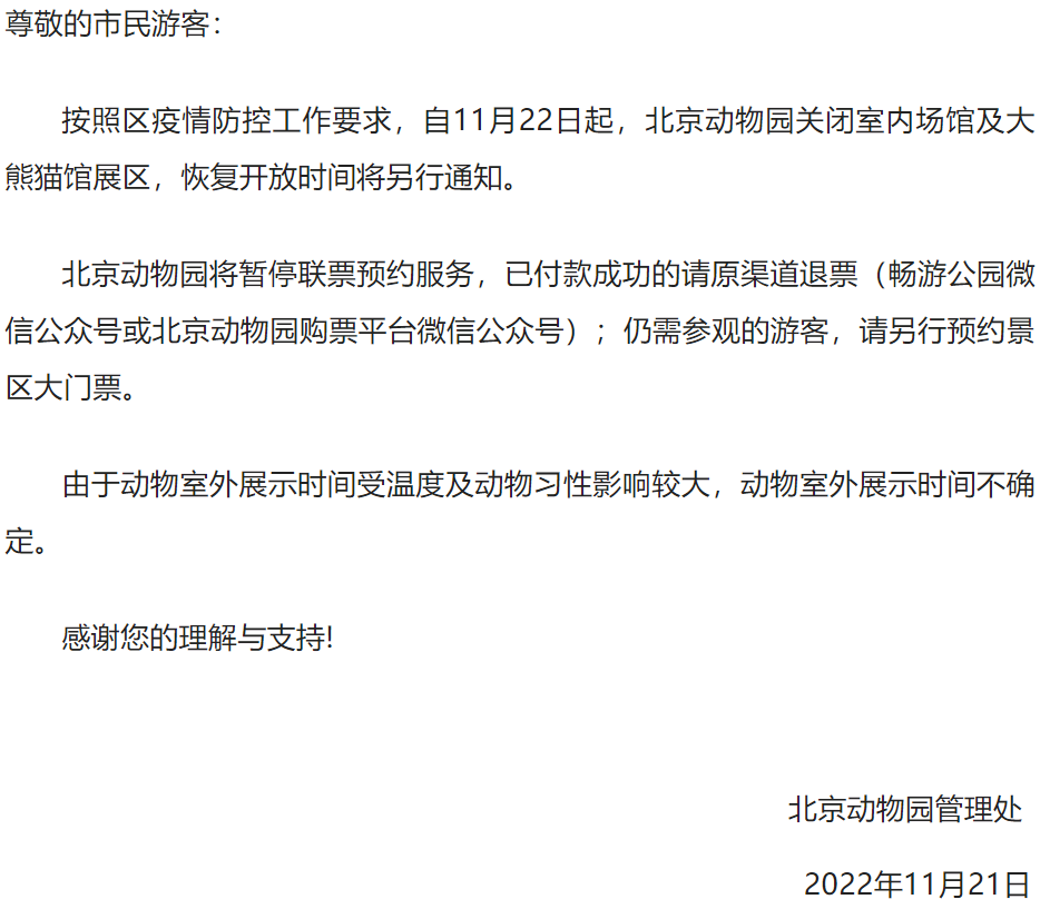 北京動物園管理處發(fā)布通知,按照西城區(qū)疫情防控工作要求,自11月22日起,北京動物園關(guān)閉室內(nèi)場館及大熊貓館展區(qū),恢復開放時間另行通知。