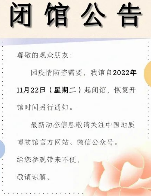 中國地質(zhì)博物館發(fā)布公告稱,因疫情防控需要,中國地質(zhì)博物館自11月22日起閉館,恢復開館時間另行通知。