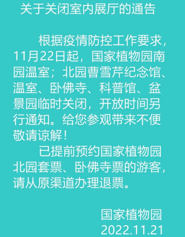 據(jù)國家植物園消息,根據(jù)疫情防控工作要求,11月22日起,國家植物園南園溫室,北園曹雪芹紀念館、溫室、臥佛寺、科普館、盆景園臨時關(guān)閉,開放時間另行通知。