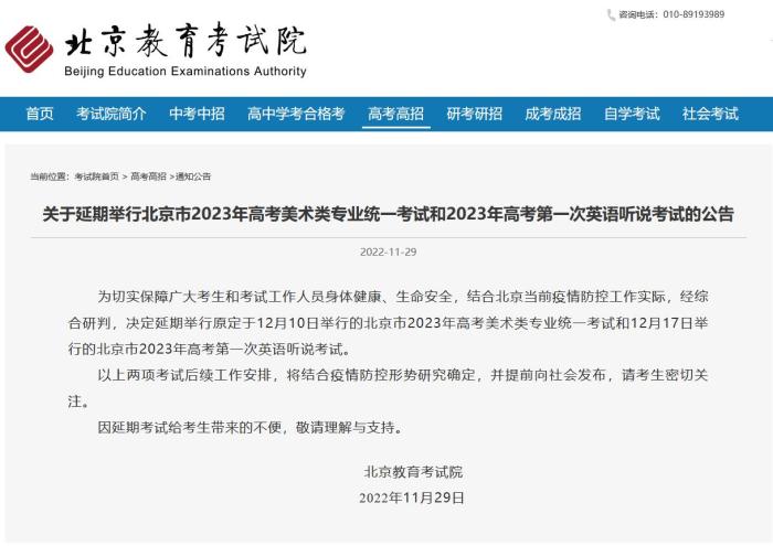 中新網(wǎng)11月29日電 據(jù)北京教育考試院網(wǎng)站消息,北京教育考試院29日發(fā)布公告,為切實(shí)保障廣大考生和考試工作人員身體健康、生命安全,結(jié)合北京當(dāng)前疫情防控工作實(shí)際,經(jīng)綜合研判,決定延期舉行原定于12月10日舉行的北京市2023年高考美術(shù)類專業(yè)統(tǒng)一考試和12月17日舉行的北京市2023年高考第一次英語(yǔ)聽說(shuō)考試。