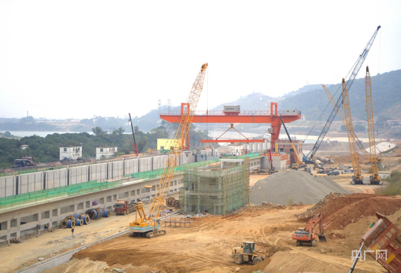 西津水利樞紐二線(xiàn)船閘工程建設(shè)正緊鑼密鼓進(jìn)行中(央廣網(wǎng)發(fā) 蔡俊聰 攝)