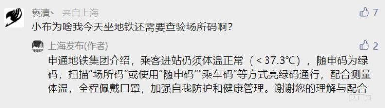 “上海發(fā)布”微信公眾號回復稱,乘客進站仍須體溫正常(<37.3℃),隨申碼為綠碼,掃描“場所碼”或使用“隨申碼”“乘車碼”等方式亮綠碼通行,配合測量體溫,全程佩戴口罩,加強自我防護和健康管理。