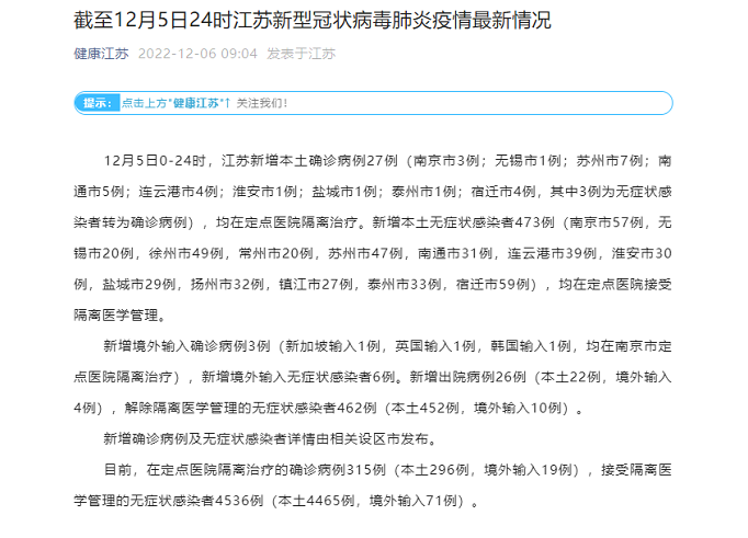 12月5日江蘇新增本土確診27例 新增本土無癥狀473例