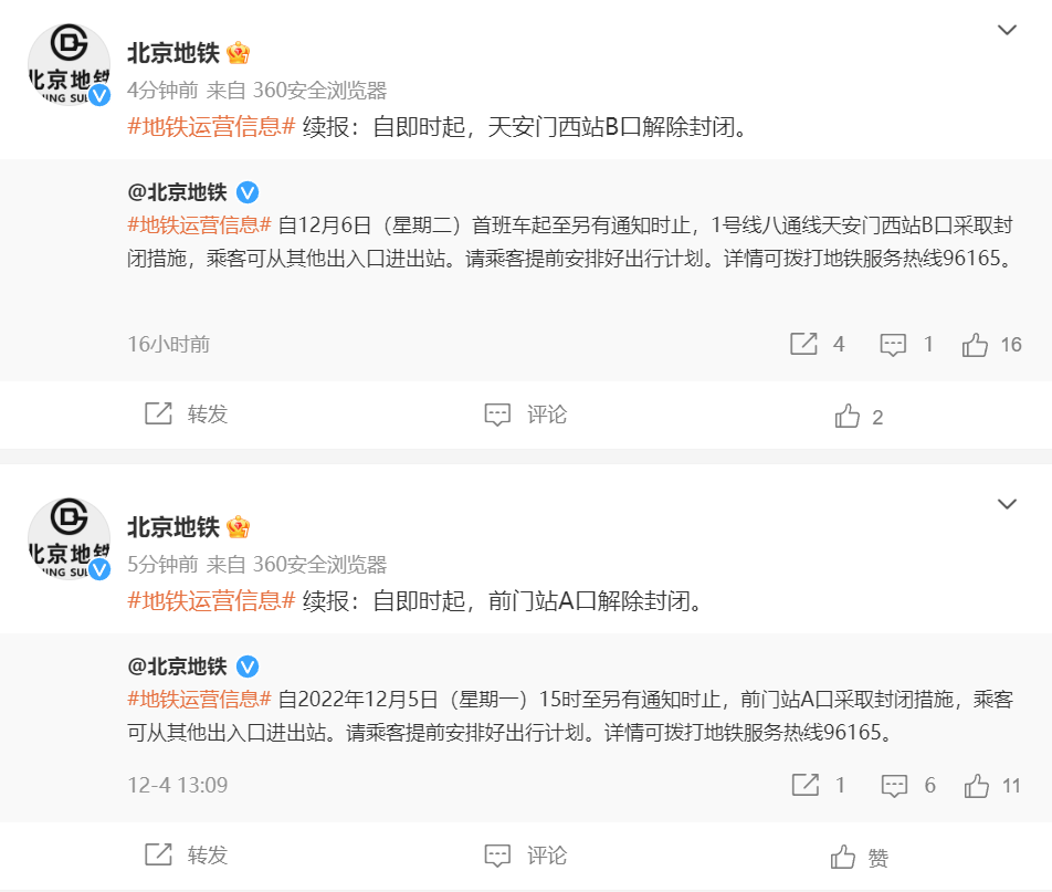 據(jù)@北京地鐵 微博消息,1號線八通線前門站A口、天安門西站B口解除封閉。