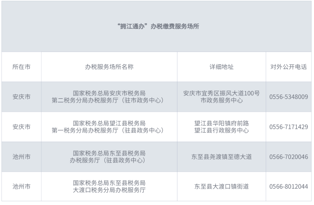 2.通辦場(chǎng)所。1.國(guó)家稅務(wù)總局安慶市稅務(wù)局第二稅務(wù)分局辦稅服務(wù)廳(駐市政務(wù)中心);2.國(guó)家稅務(wù)總局望江縣稅務(wù)局第一稅務(wù)分局辦稅服務(wù)廳(駐縣政務(wù)中心);3.國(guó)家稅務(wù)總局東至縣稅務(wù)局辦稅服務(wù)廳(駐縣政務(wù)中心);4.國(guó)家稅務(wù)總局東至縣稅務(wù)局大渡口稅務(wù)分局辦稅服務(wù)廳,以上4個(gè)辦稅繳費(fèi)場(chǎng)所均可辦理“擁江通辦”事項(xiàng),辦稅繳費(fèi)場(chǎng)所詳見附件1。