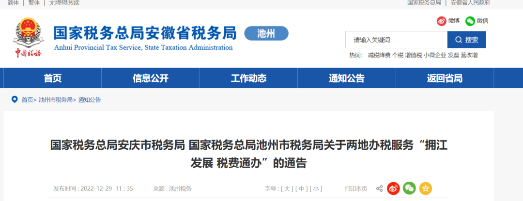 近日,為方便安徽安慶池州兩地納稅人繳費(fèi)人辦理跨區(qū)域涉稅事項(xiàng),落實(shí)安慶池州“一江兩岸擁江發(fā)展”規(guī)劃,進(jìn)一步優(yōu)化稅收營(yíng)商環(huán)境。國(guó)家稅務(wù)總局安慶市稅務(wù)局、國(guó)家稅務(wù)總局池州市稅務(wù)局發(fā)布《關(guān)于兩地辦稅服務(wù)“擁江發(fā)展稅費(fèi)通辦”的通告》。