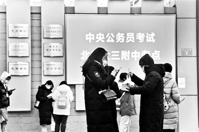 昨日早上8點(diǎn),北京師范大學(xué)第三附屬中學(xué)的考點(diǎn)已有考生陸續(xù)到場。一些公考輔導(dǎo)機(jī)構(gòu)在考點(diǎn)門前派發(fā)復(fù)習(xí)資料,北京青年報(bào)記者看到,黨的二十大報(bào)告,北京冬奧會(huì)、冬殘奧會(huì),2022年中央一號文件等時(shí)事熱點(diǎn)都被列為重點(diǎn)內(nèi)容。8點(diǎn)20分,考生開始入場。工作人員手持測溫儀,對每個(gè)考生進(jìn)行測溫??键c(diǎn)內(nèi)的一樓也設(shè)置了兩個(gè)備用考場。據(jù)悉,按照要求,有發(fā)熱(體溫≥37.3℃)等可疑癥狀的,應(yīng)服從安排在備用考場佩戴N95口罩參加考試。