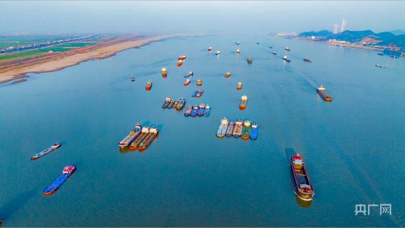 長江航道江西省九江市湖口縣水域船舶往來穿梭,水運(yùn)一派繁忙(央廣網(wǎng)發(fā) 余杰 攝)