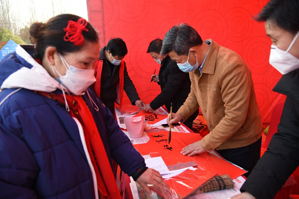 臺(tái)上歡歌載舞,臺(tái)下人頭攢動(dòng)。配鑰匙、法律援助咨詢(xún)、醫(yī)生義診、眼鏡修理等服務(wù),吸引了不少村民。書(shū)法家們現(xiàn)場(chǎng)書(shū)寫(xiě)幾百幅福字,將新年的美好祝愿贈(zèng)予村民。