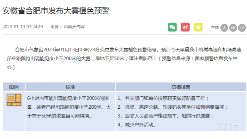 央廣網(wǎng)合肥1月13日消息(記者鮑玉嬋)記者從安徽省氣象局獲悉,合肥市氣象臺2023年01月13日03時23分變更發(fā)布大霧橙色預(yù)警信號。預(yù)計今天早晨我市繞城高速和機場高速部分路段將出現(xiàn)能見度小于200米的大霧,局地不足50米,請注意防范!