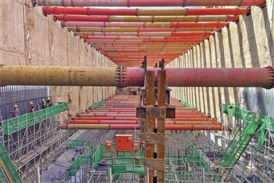 在北京地鐵22號(hào)線(平谷線)管莊站項(xiàng)目現(xiàn)場(chǎng),在地下31米,工人們正在進(jìn)行鋼筋綁扎、混凝土澆筑工作,300余名工人正在為該車站主體結(jié)構(gòu)施工完成作出努力。