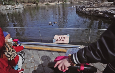 16日上午,在動物園的水禽區(qū)域,不少家長帶著孩子在水邊觀鳥,大家用手機拍下小動物們展翅或在水中覓食的畫面,但沒有一位家長或者孩子向水中的小鴨子、鵜鶘等私自投喂食物。