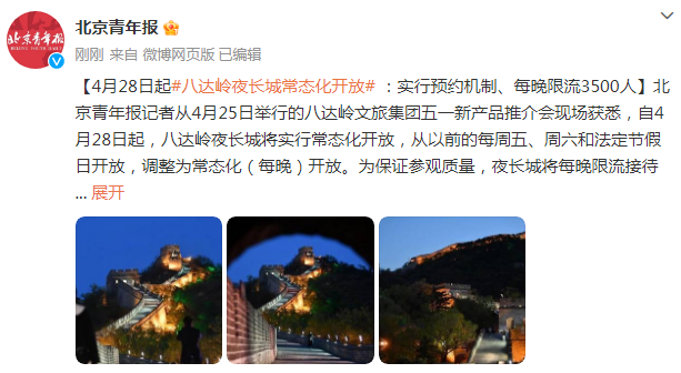 4月28日起八達(dá)嶺夜長城常態(tài)化開放:實行預(yù)約機(jī)制、每晚限流3500人