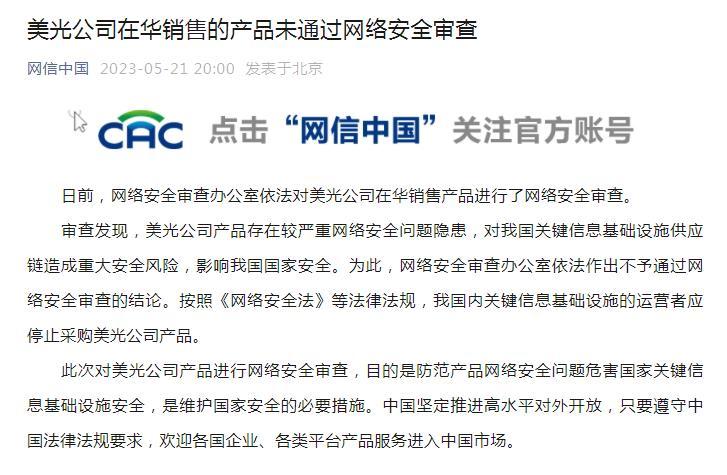 中新網(wǎng)5月21日電 據(jù)“網(wǎng)信中國”微信公眾號消息,日前,網(wǎng)絡(luò)安全審查辦公室依法對美光公司在華銷售產(chǎn)品進行了網(wǎng)絡(luò)安全審查。