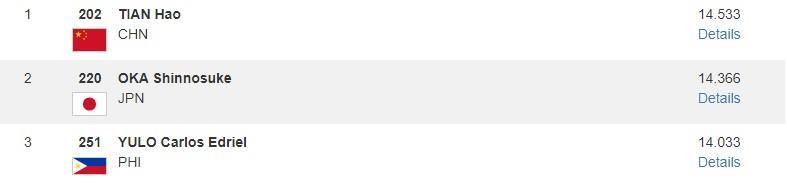 男子單杠項目,田昊以14.533分奪得冠軍。另一名中國選手蘇煒德以11.866分排名第七。