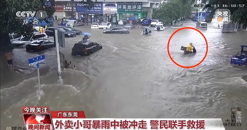 汛期強(qiáng)降雨,不僅會(huì)給高速行車帶來不便,也會(huì)增加路面的安全隱患。民眾出行又該如何科學(xué)避險(xiǎn)呢?這段畫面顯示,6月13日下午的一場暴雨,造成廣東東莞多處街道被水淹沒。當(dāng)天下午,一名外賣騎手為了配送訂單,不顧執(zhí)勤人員阻攔,堅(jiān)持逆流而上。結(jié)果在前行過程中,受到水流的猛烈沖擊,騎手失去平衡,連人帶車被水一起沖走。在緊急關(guān)頭,幸虧現(xiàn)場執(zhí)勤巡警與另一名外賣員及時(shí)出手,合力將該名外賣騎手拉住,才避免了悲劇的發(fā)生。