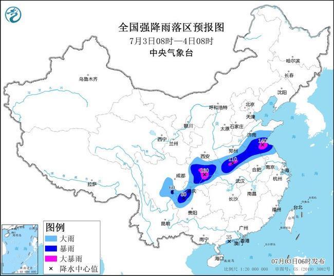 預計,7月3日08時至4日08時,山東中南部、江蘇北部、安徽北部、河南東部和南部、湖北北部和西部、陜西南部、重慶、四川東部、貴州西北部、云南東北部以及廣東西南部沿海等地部分地區(qū)有大到暴雨,其中,山東南部、江蘇北部、河南南部、重慶北部、四川東北部等地局地有大暴雨(100~160毫米)。上述部分地區(qū)伴有短時強降水(最大小時降雨量30~50毫米,局地可超過60毫米),局地有雷暴大風等強對流天氣。